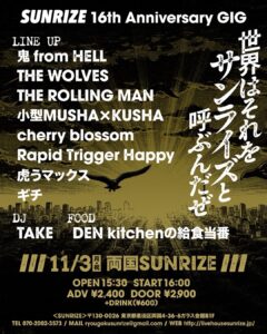 2025.11.29 (Sat) Shinjuku GODZ, Tokyo 2025 8/18 LIVE SHOW 2025年8月18日開場/開演(Open/Start):TBA/TBA 会場(Place):新宿GODZ (Shinjuku) 場所(Adress):東京都新宿区歌舞伎町1-10-5 B1 MAP出演TBAチケット予約はこちらから日程(Date) 枚数(Number of ticket) 1枚2枚3枚4枚 お名前(Your name) メールアドレス(E-mail) お電話番号(Phone number) 予期しない問題が発生しました。 後でもう一度やり直すか、他の方法で管理者に連絡してください。 LIVE SHOW Please share! URLをコピーしました! URLをコピーしました! LIVE MOVIE - "YA・KU・SO・KU~プロミス~" 2025.12.14 (Sun) Shinjuku ANTIKNOCK, Tokyo 関連記事 2025.12.14 (Sun) Shinjuku ANTIKNOCK, Tokyo 2025年8月18日 2025.11.03 (Mon) Ryogoku SUNRIZE, Tokyo 2025年7月3日